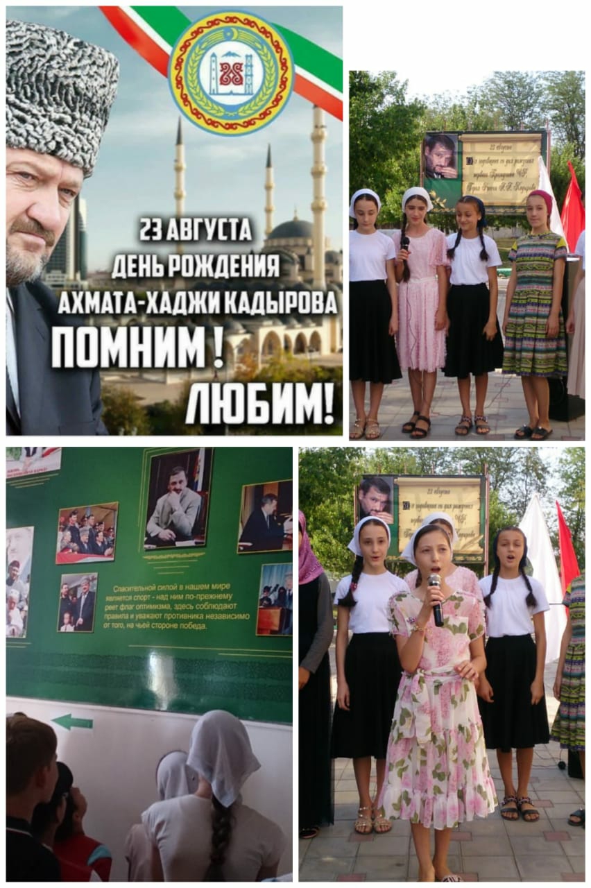 Кадыров – герой России». В честь празднования 68-й годовщины со дня рождения первого президента Чеченской Республики, героя России – А-Х. Кадырова в МБОУ "Калиновская СОШ" провели мероприятие в виде беседы под названием «А-Х. Кадыров – герой России». Детям рассказали о нелегкой судьбе А-Х. Кадырова, его геройском пути, о том, как в самый переломный момент в истории чеченского народа появлялся лидер, который вывел свой народ на правильную дорогу. Сегодня 23 августа, исполнилось 68 лет со дня его рождения. Во всех школах Чечни проходят религиозные обряды, проводятся жертвоприношения, читают мовлид. А также наша школа МБОУ "Калиновская СОШ" не осталось в стороне, провели мероприятие .
