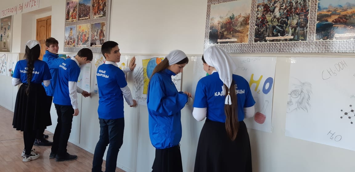 3.02.2020г. В МБОУ "Калиновская СОШ " активисты ЕДЮО Юные "Кадыровцы" провели выставку стенгазет приуроченную к недели естественных наук "биология, химия, география"