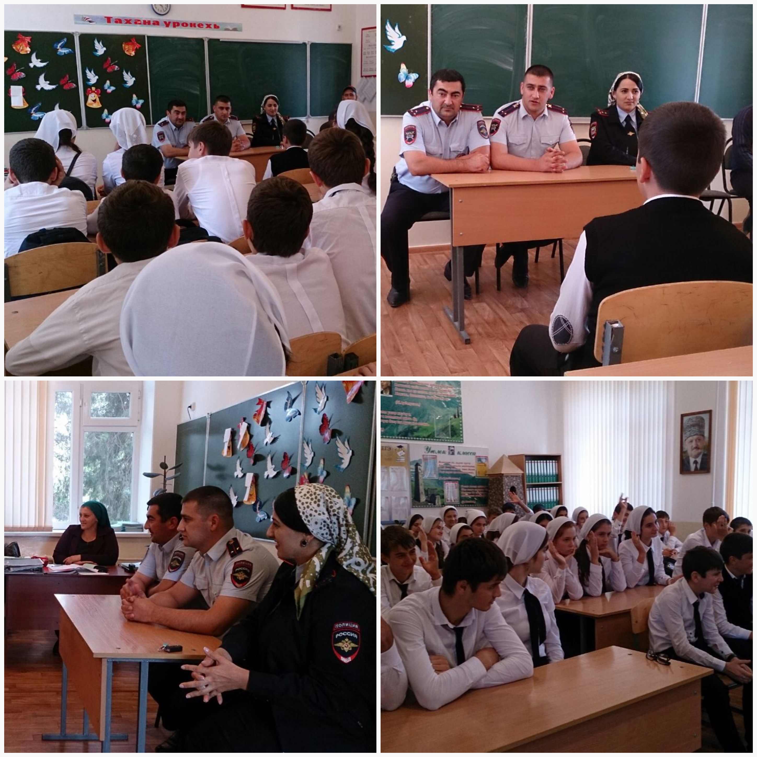 29.09.2017Была организована обучающимися 8-11кл. встреча с инспектором ОГИБДД ОМВД России по Наурскому району, лейтенантом полиции Хункурхановым Магомедедом Хамзатовичем, Государственным инспектором ОГИБДД ОМВД России по Наурскому району, старшим лейтенантом полиции Зубайраевым Хизиром Вахаевичем и ПДН Дазаевой Хеди Исаевной. Гости провели беседу на темы: "Пешеход, дорога в школу ", "Правила ПДД - знать всем!"