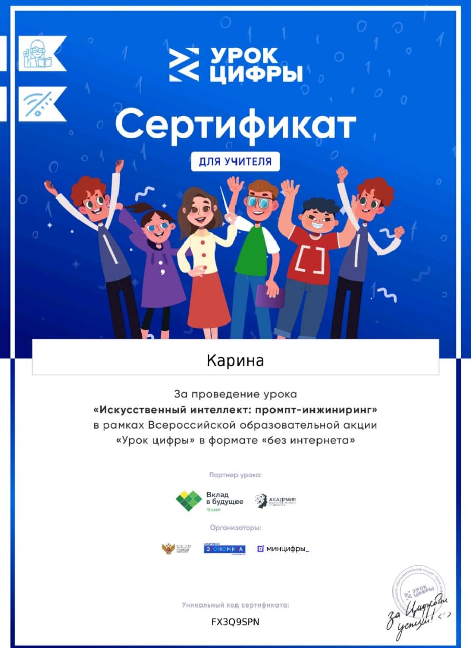 07.10.2024В рамках урока «Искусственный интеллект: промпт-инжиниринг» обучающимся 5–11 классов демонстрируется как с помощью промптинга взаимодействовать с искусственным интеллектом по решению различных задач в обучении, проектировании, творчестве, в поиске нужной информации и идей. На практике обучающиеся смогут узнать, как обучать модели и получать именно тот результат, который необходим. На занятии обучающиеся с вашей поддержкой разберут и закрепят на практике с помощью тренажера, что такое нейросети, агент-модели, промпт, а также изучат алгоритм написания запросов.