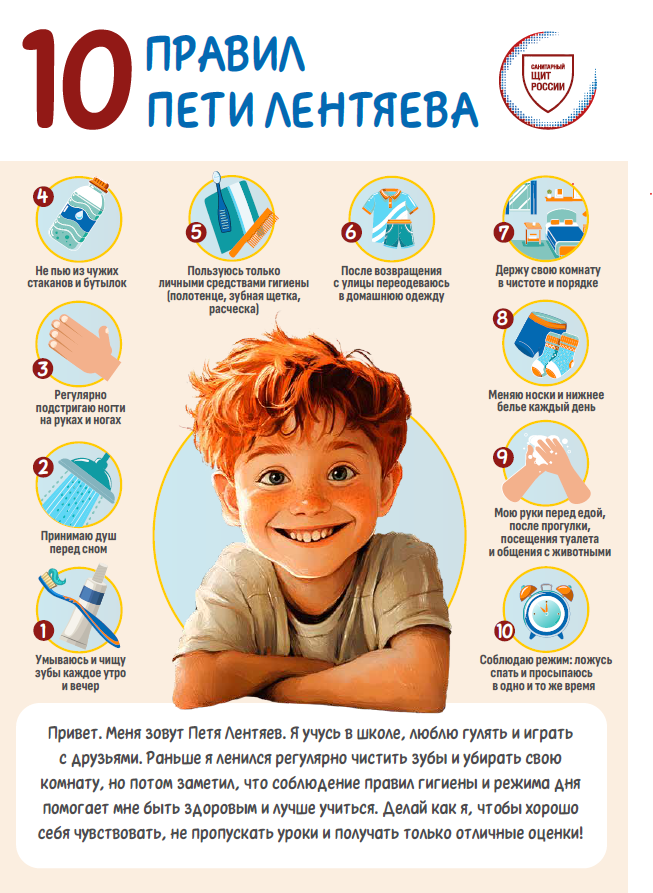 14.10.2024Творческая работа одного из победителей Всероссийского конкурса детских рисунков «Персонаж здорового образа жизни» 2023 года, где был изображен Петя Лентяйкин, вдохновила нашу команду создать познавательные и яркие визуальные материалы по Санпросвету для детей. Так появился Петя Лентяев – веселый школьник, задорный мальчишка, который раньше ленился, но потом понял, что соблюдение простых правил гигиены, правильное питание и здоровый образ жизни помогают лучше себя чувствовать и хорошо учиться. Теперь Петя в доступной и простой форме рассказывает другим детям про важные правила заботы о здоровье.