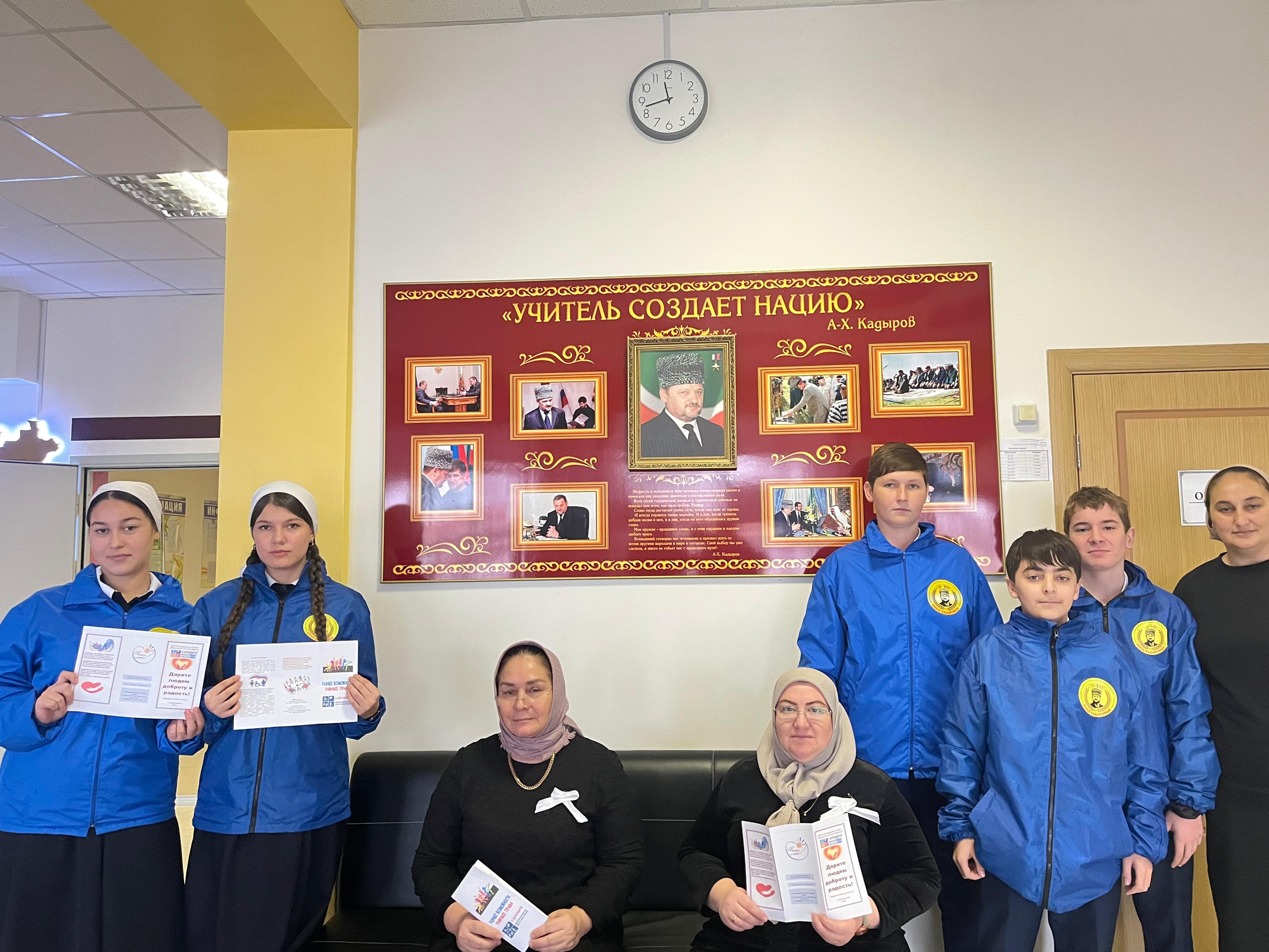 Акция проведена руководителем отрядов Х.С-Н.Хайдаровой участие отряд ЮК,Юнармия в мероприятии участники отрядов раздавали учителям символические белые ленточки,буклеты.