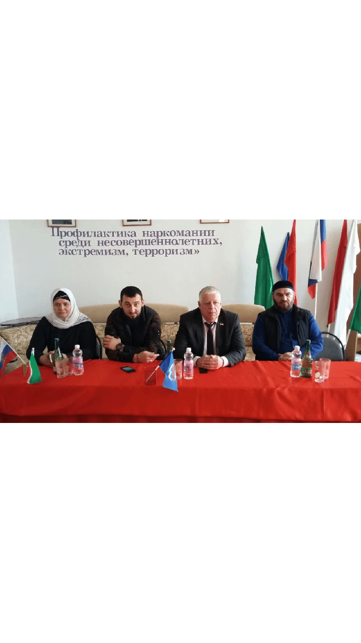 29.11.2017Депутат Парламента ЧР, члены фракции «Единая Россия» - Владимир Кашлюнов, Глава Администрации с/п Хулаев А.А., педагог по ДНВ Мыжидов А - Х. и директор школы Садаева Р.С. провели беседу с обучающимися МБОУ "Калиновская СОШ" Наурского района. В беседе обсуждались темы по профилактике наркомании, употребления и распространения в молодёжной среде наркотических средств и психотропных препаратов. Также обсудили актуальные вопросы борьбы с наркоманией, экстремизмом и терроризмом.